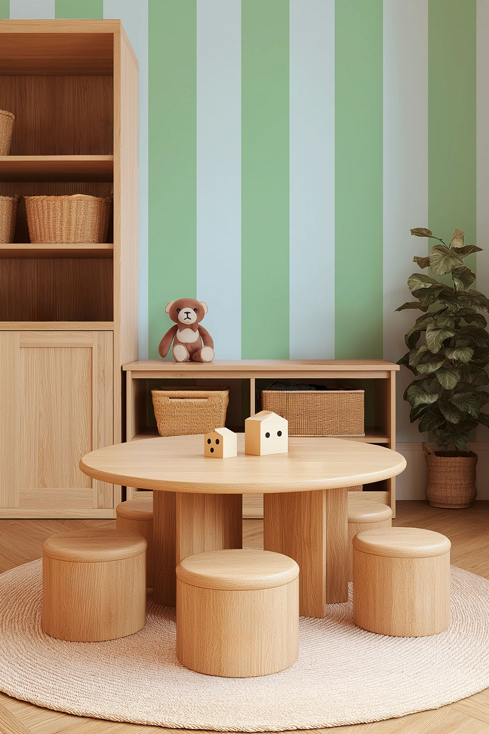 kid's playroom with in modern new build interior designed home with peaceful wide stripe traditional wallpaper in light green and blue, perfect for a gender neutral kid's bedroom or nursery
