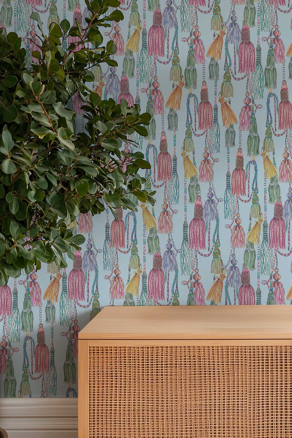tassel wallpaper, chinoiserie tassel wallpaper, chintz wallpaper pattern, traditional interior wallcovering, classic trellis wallpaper, hand painted tassel art, elegant statement wallpaper, decorative tassel design