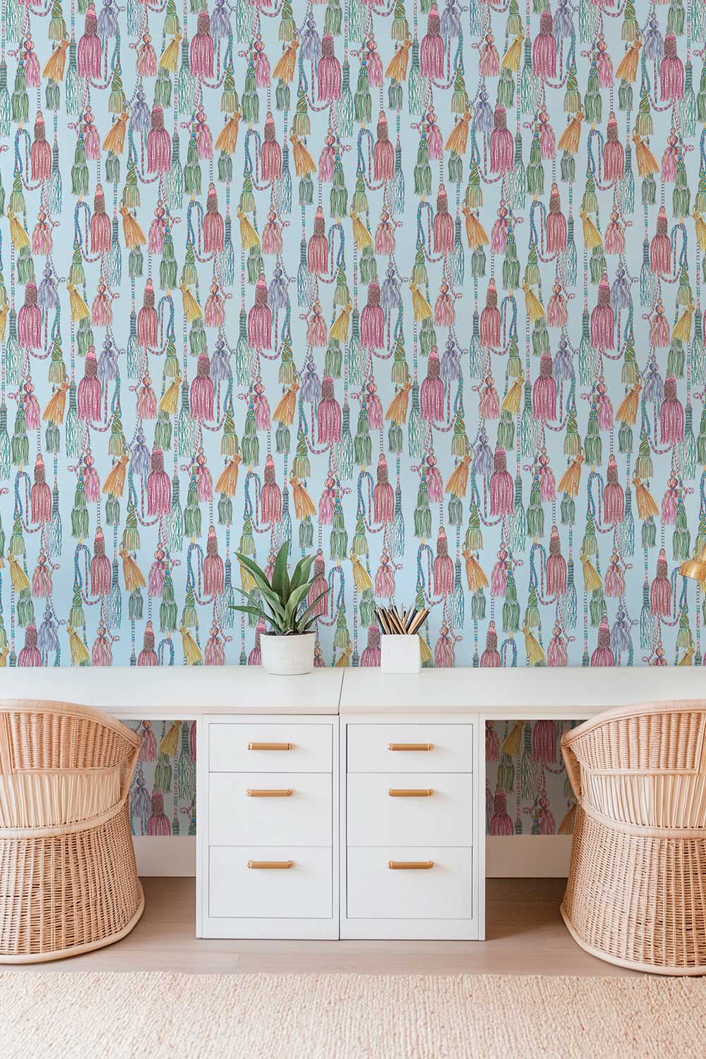 Watercolor tassel trellis wallpaper in neutral and colorful colorways, inspired by classic chinoiserie and traditional decorative textiles for luxury home offices