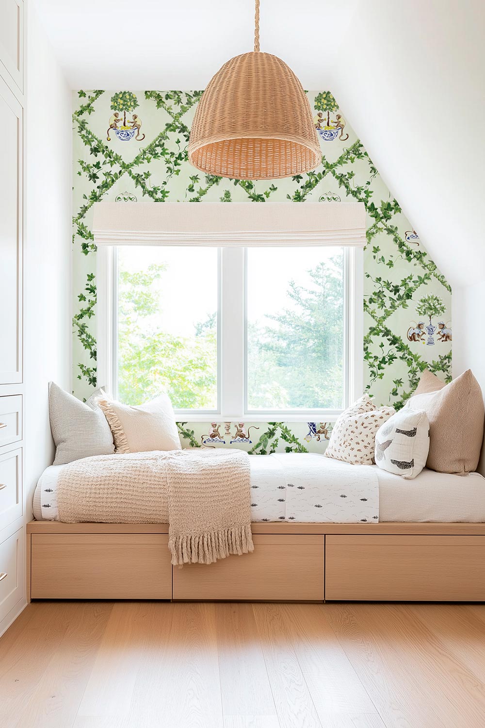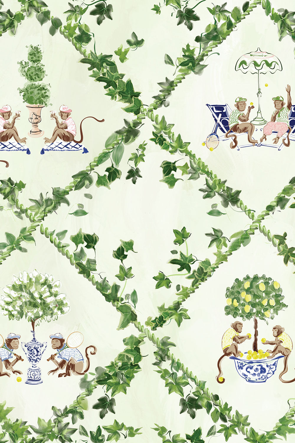 tennis wallpaper, country club chinoiserie wallpaper, tennis club decor ideas, botanical trellis wallpaper, whimsical chinoiserie wallcovering, racquet club wallpaper, designer tennis room wallpaper, monkey tennis wallpaper