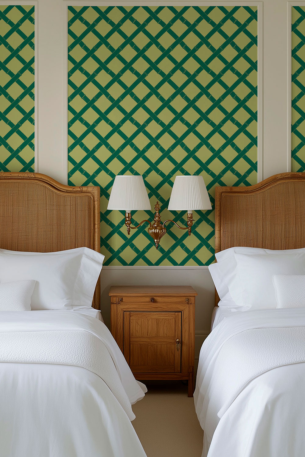 We designed Tropicana Trellis as the perfect mix of stripe, geo, and garden-inspired color. It was born from my love of the classic garden trellis, the kind that feels like it’s guiding you into an English country garden. The layout is simple and easy, but with just enough subtle detail to make it interesting. I love how versatile it is. This geometric wallpaper is bold enough to layer with other patterns in an eclectic room, but calm and free-flowing in spaces like a welcoming entryway or a master bedroom retreat. Honestly, I think it’s the kind of wallpaper that works just about anywhere.
