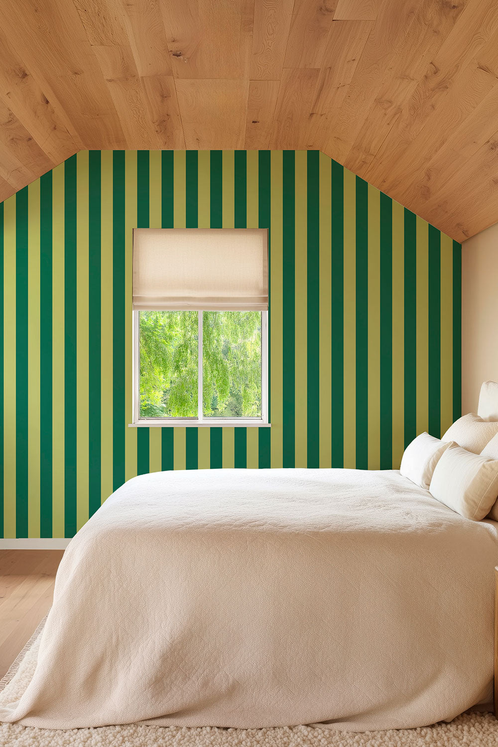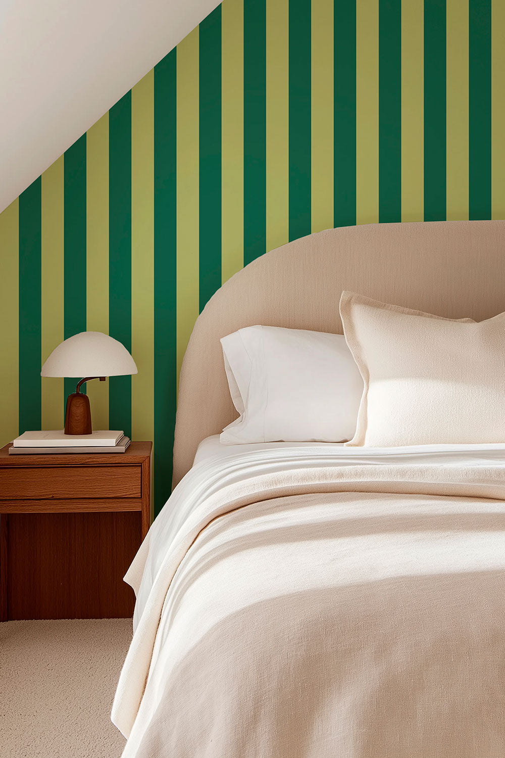 luxury Bedroom with green and lime classic striped wallpaper for interior designers