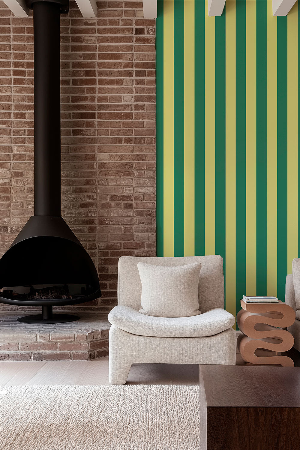 Modern living room with a brick wall, fireplace, and high-end bold colored green and lime striped wallpaper