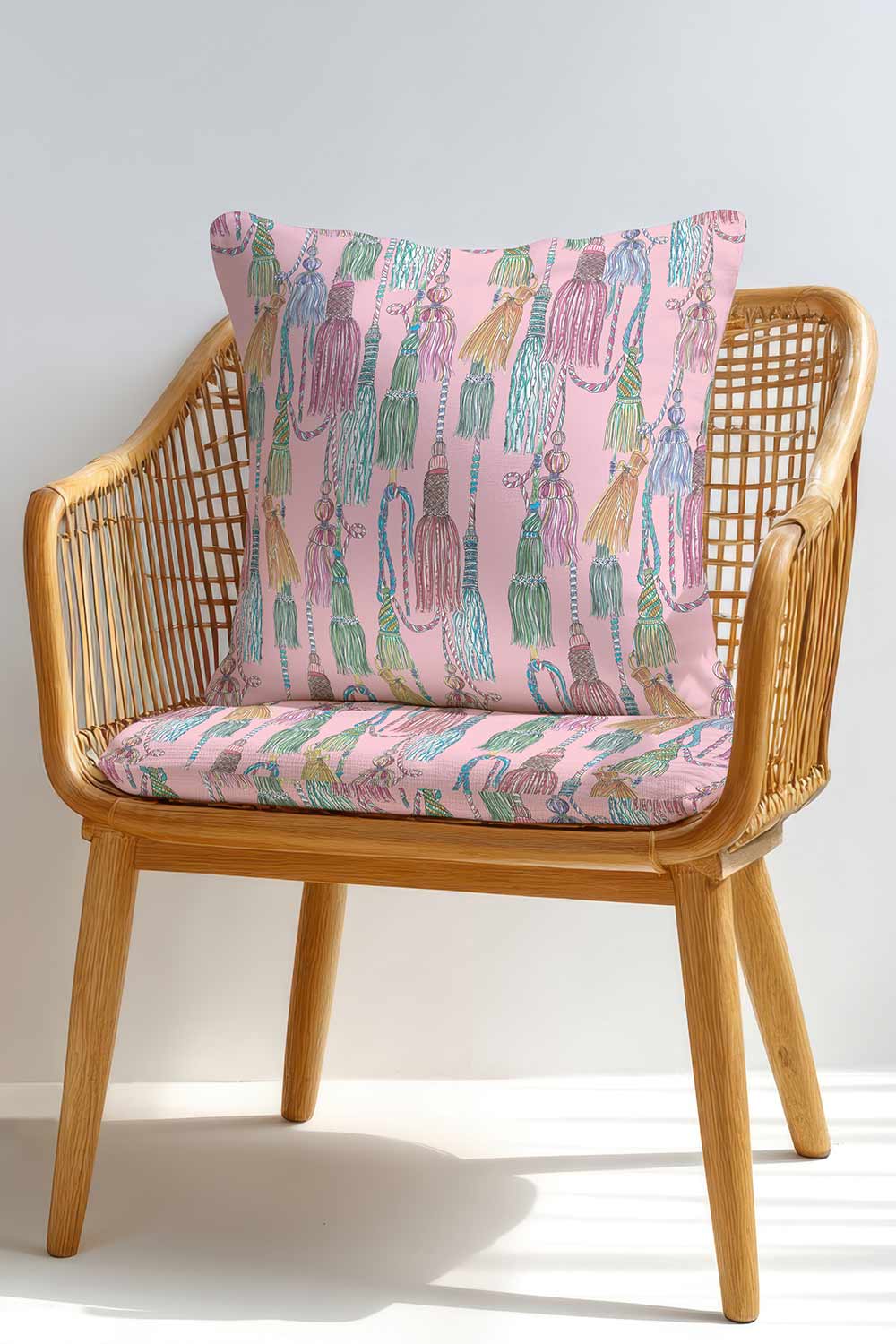 Decorative upholstery fabric with hand-painted watercolor tassels arranged in an allover trellis pattern, rich in texture and detail, pink base with shades of pastel tassels. Chinoiserie style design.