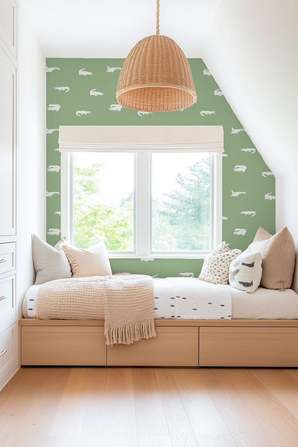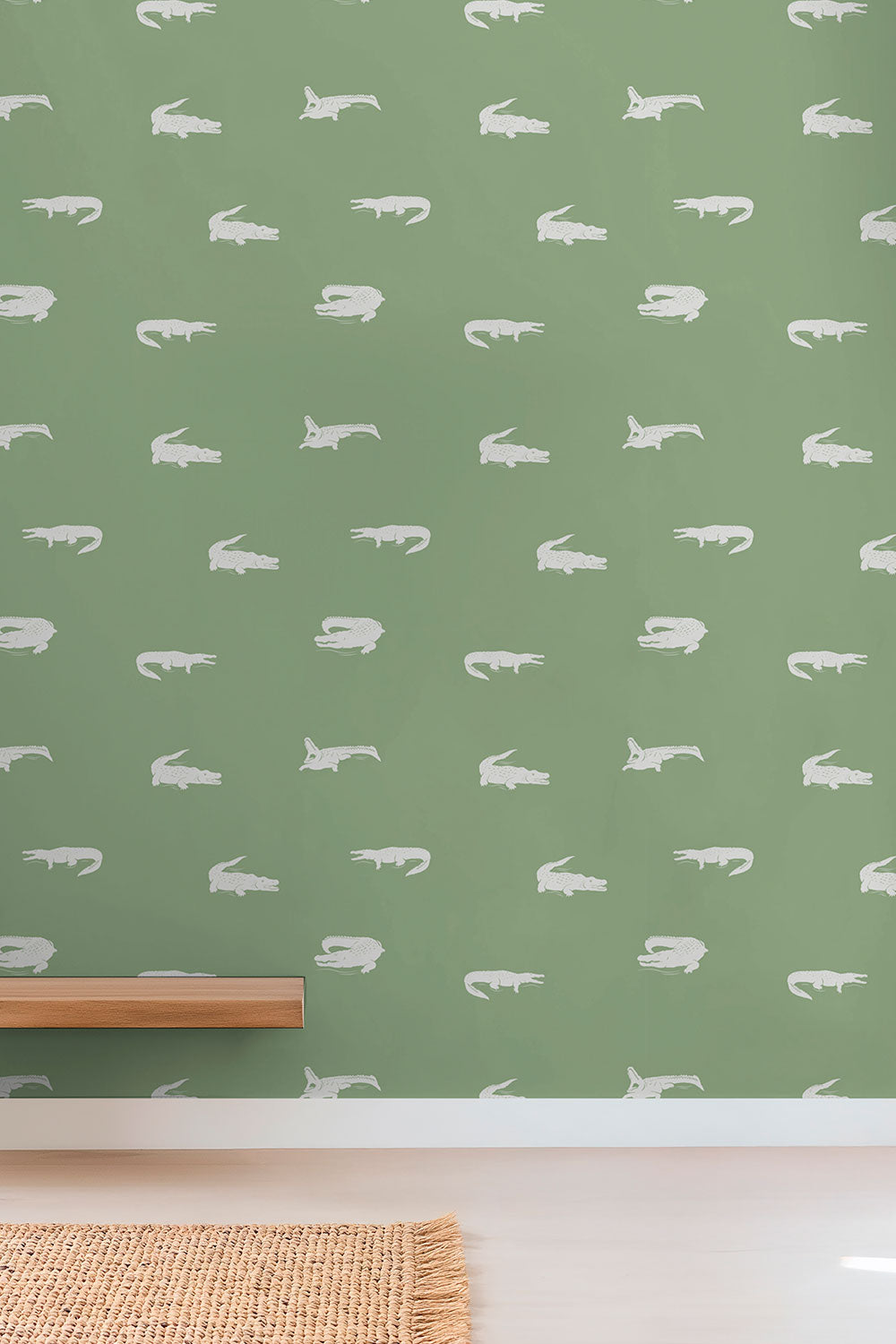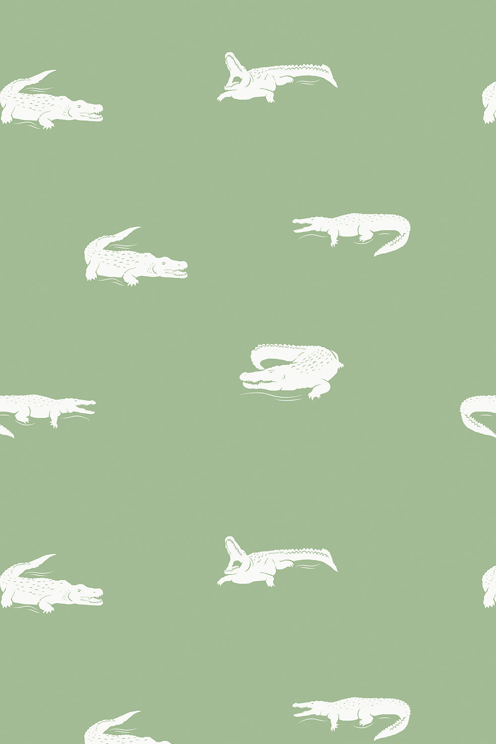 playful kids green and white tropical animal crocodile wallpaper for coastal houses and kid's bedrooms and playrooms