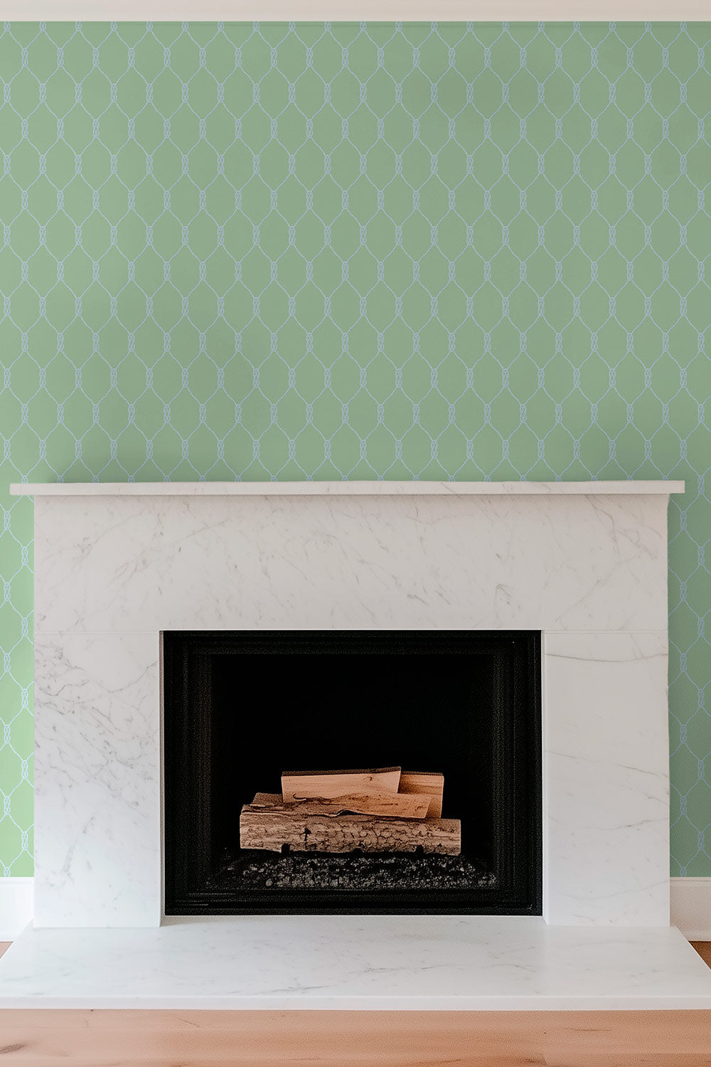 Matte wallpaper featuring a repeating twisted rope-knot geometric pattern on a smooth traditional paper surface on coastal inspired green and blue perfect for interior designed living rooms