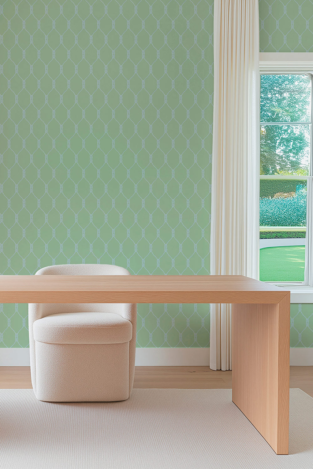 Matte wallpaper featuring a repeating twisted rope-knot geometric pattern on a smooth traditional paper surface on coastal inspired green and blue perfect for feminine luxury home offices