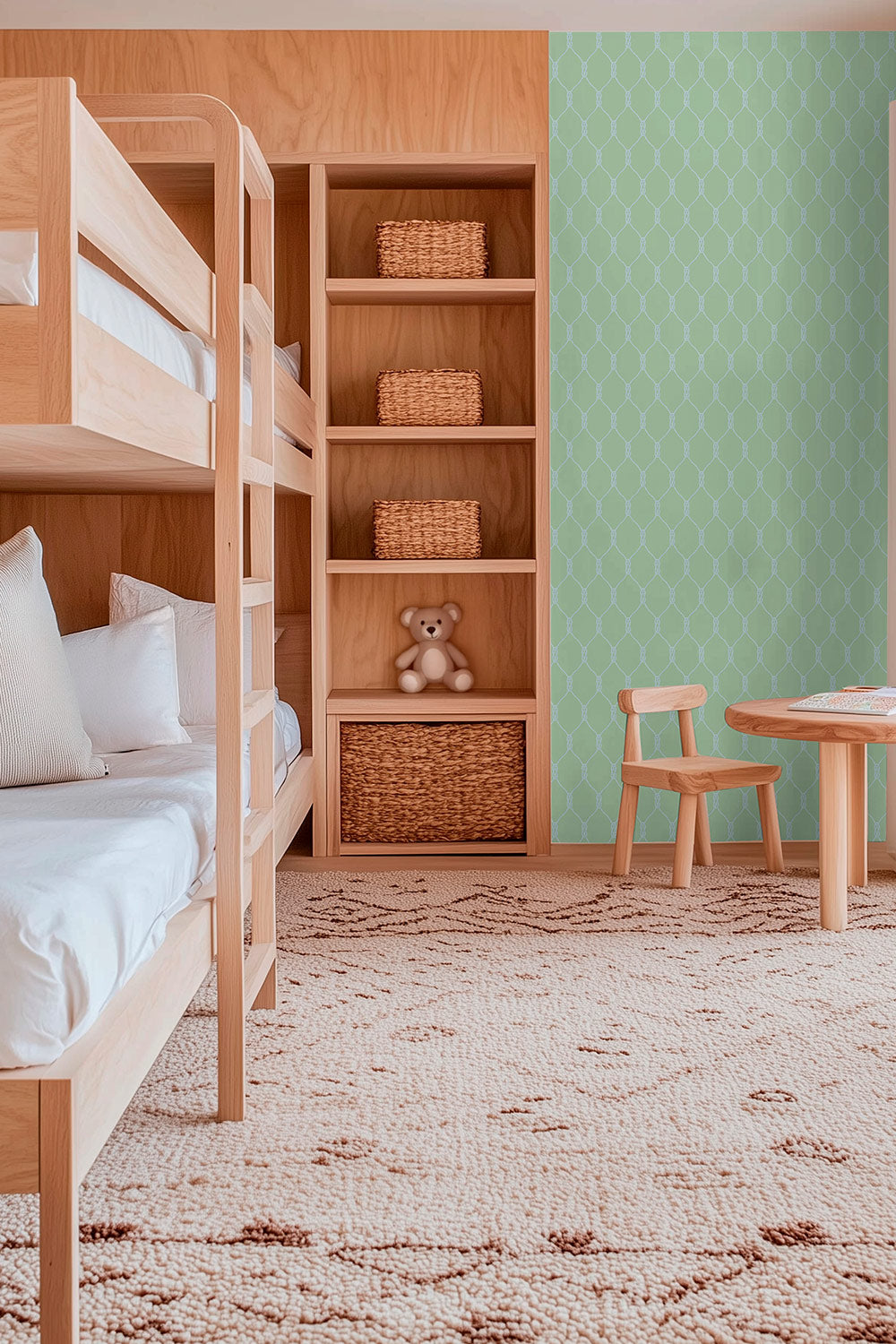 Matte wallpaper featuring a repeating twisted rope-knot geometric pattern on a smooth traditional paper surface on coastal inspired green and blue perfect for kid's bedrooms and playrooms