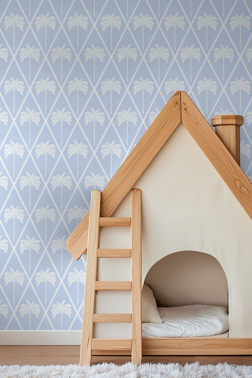 stain resistant and washable wallpaper in french blue and white lattice layout with tropical palm trees.  great for kids spaces like this because of it's performance characteristics.