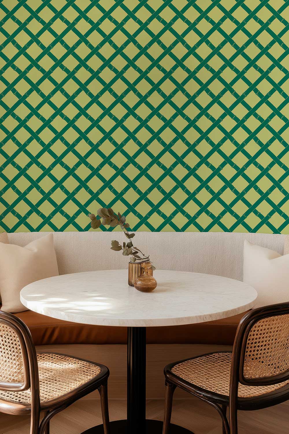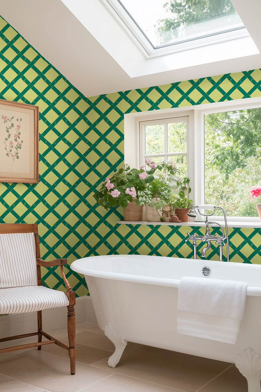 We designed Tropicana Trellis as the perfect mix of stripe, geo, and garden-inspired color. It was born from my love of the classic garden trellis, the kind that feels like it’s guiding you into an English country garden. The layout is simple and easy, but with just enough subtle detail to make it interesting. I love how versatile it is. This geometric wallpaper is bold enough to layer with other patterns in an eclectic room, but calm and free-flowing in spaces like a welcoming entryway or a master bedroom retreat. Honestly, I think it’s the kind of wallpaper that works just about anywhere.