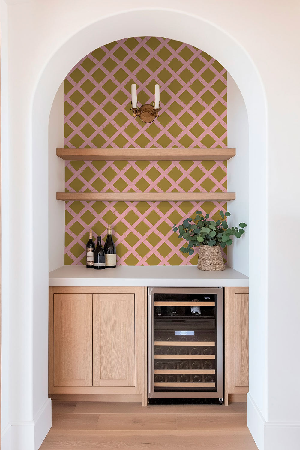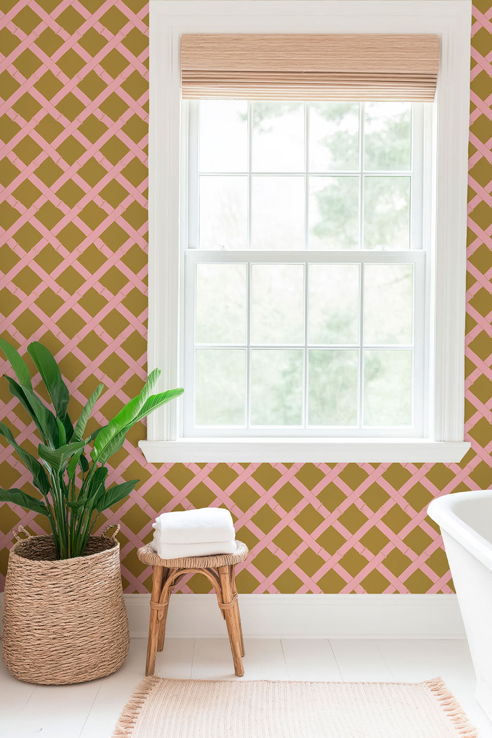 We designed Tropicana Trellis as the perfect mix of stripe, geo, and garden-inspired color. It was born from my love of the classic garden trellis, the kind that feels like it’s guiding you into an English country garden. The layout is simple and easy, but with just enough subtle detail to make it interesting. I love how versatile it is. This geometric wallpaper is bold enough to layer with other patterns in an eclectic room, but calm and free-flowing in spaces like a welcoming entryway or a master bedroom retreat. Honestly, I think it’s the kind of wallpaper that works just about anywhere.