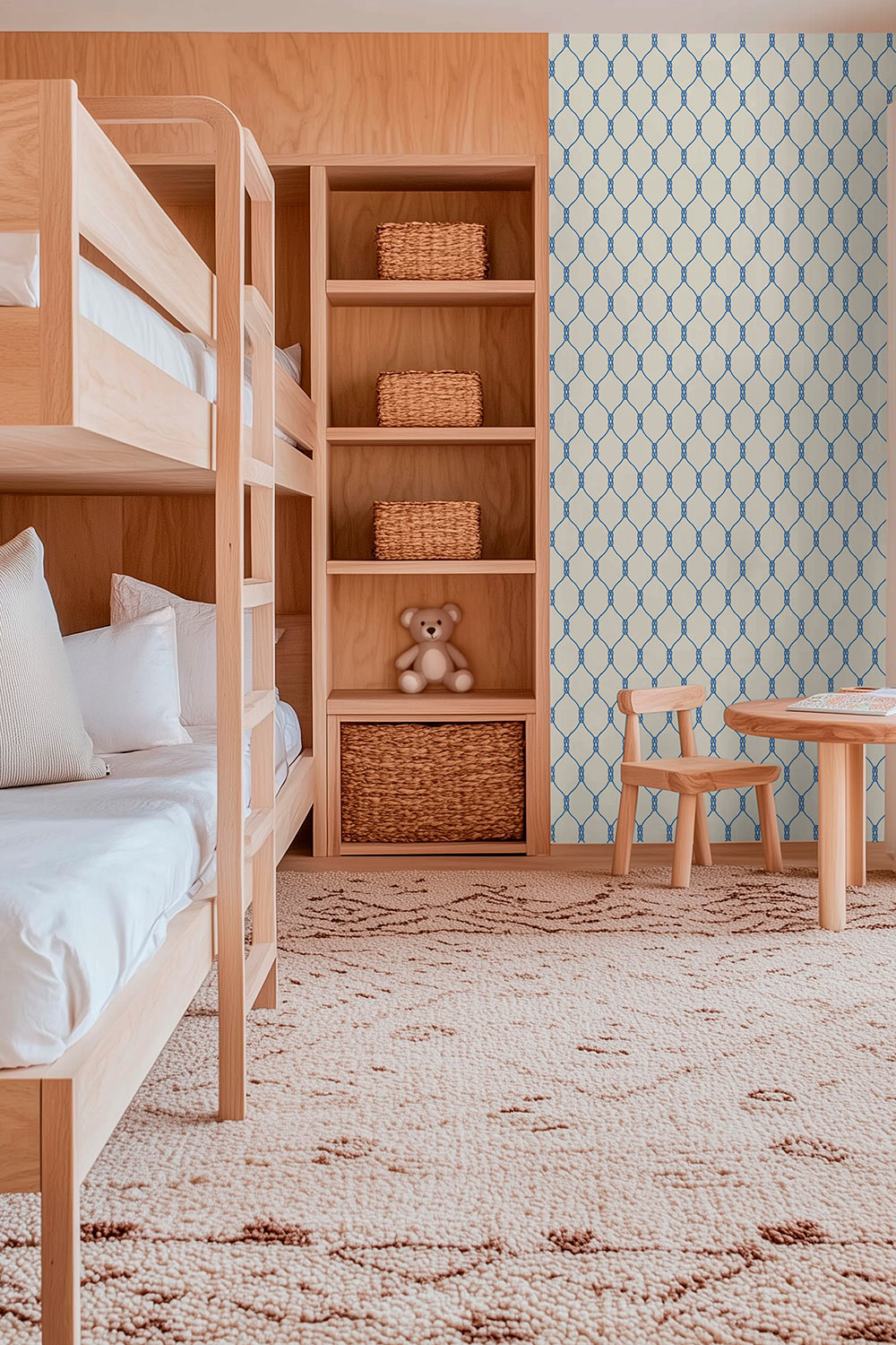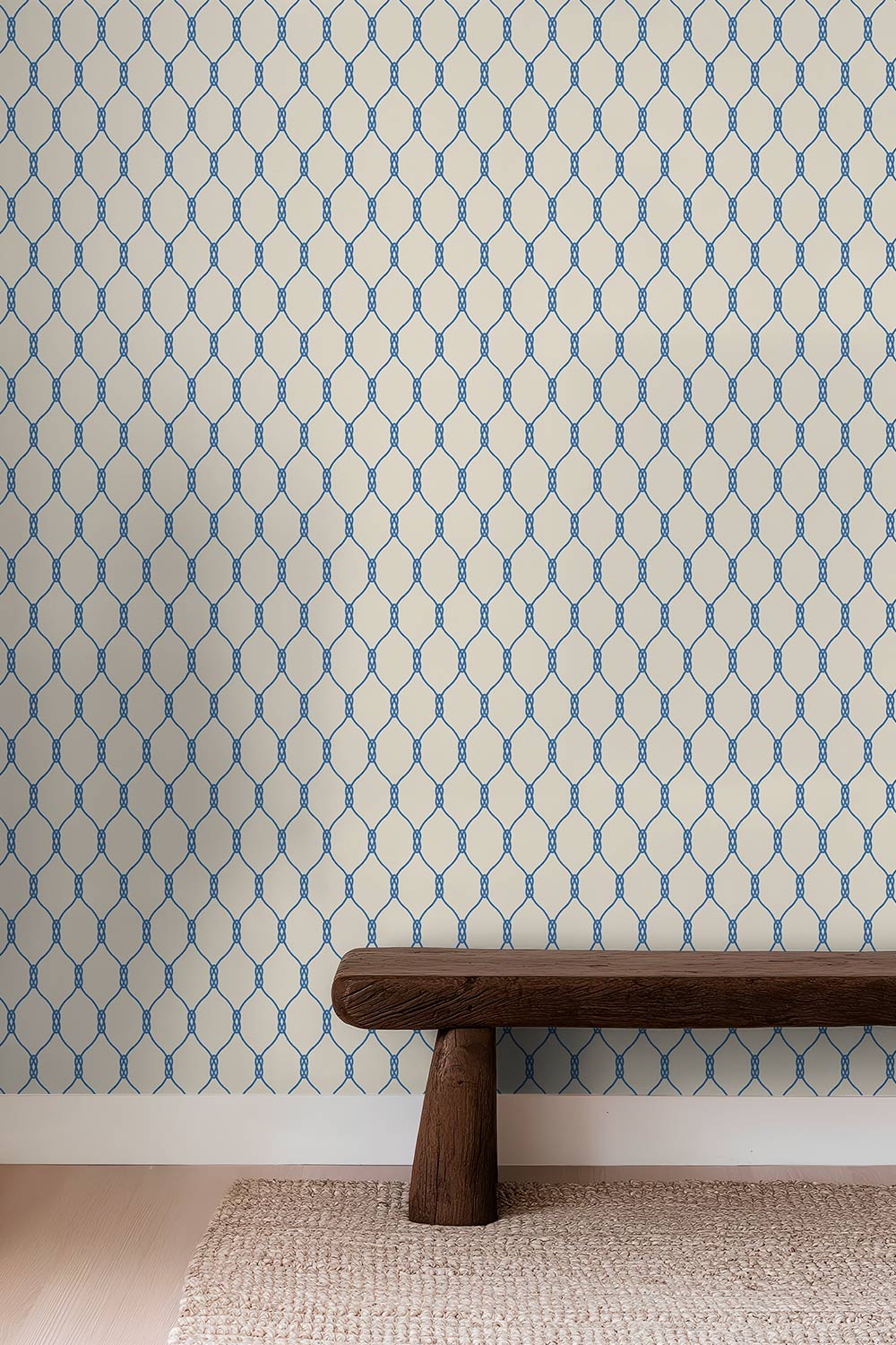 This one is deceptively simple… and that’s exactly why I love it. Our Nautical Knots wallpaper is inspired by classic maritime ropework; those beautiful, specialty knots you see on sailboats and old-school coastal docks. Up close, you catch all the little tonal details in the twisted ropes and the geometric pattern they create, but from a distance, it just feels like a really chic, subtle print.