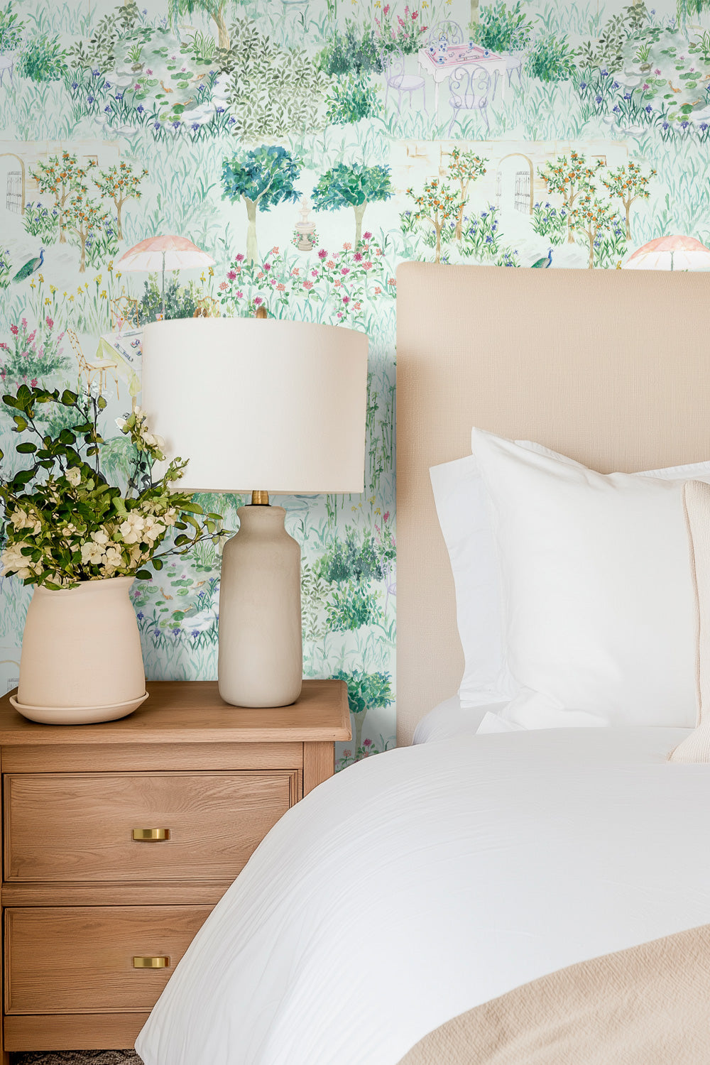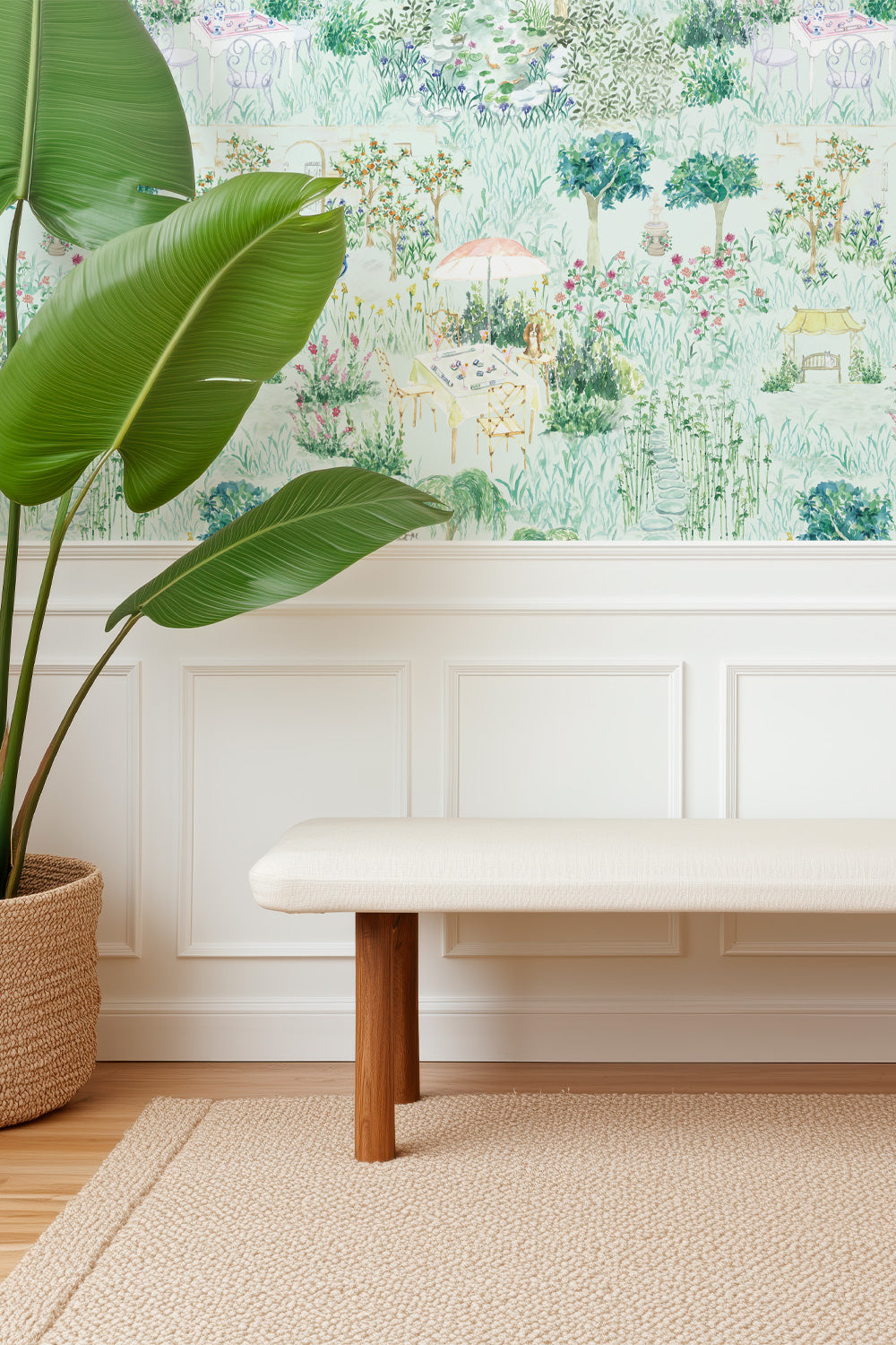 garden toile wallpaper, mahjong inspired wallpaper, chinoiserie garden wallpaper, watercolor toile wallpaper, dining room wallpaper, game room wallpaper, traditional garden wallpaper with hidden details, luxury toile wallpaper.