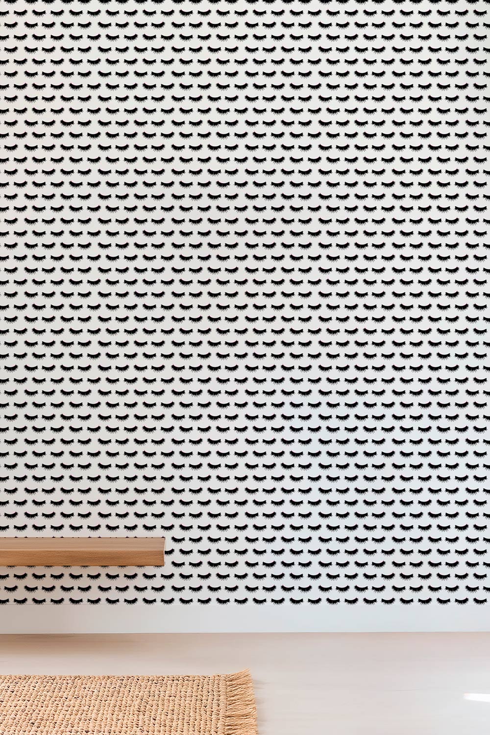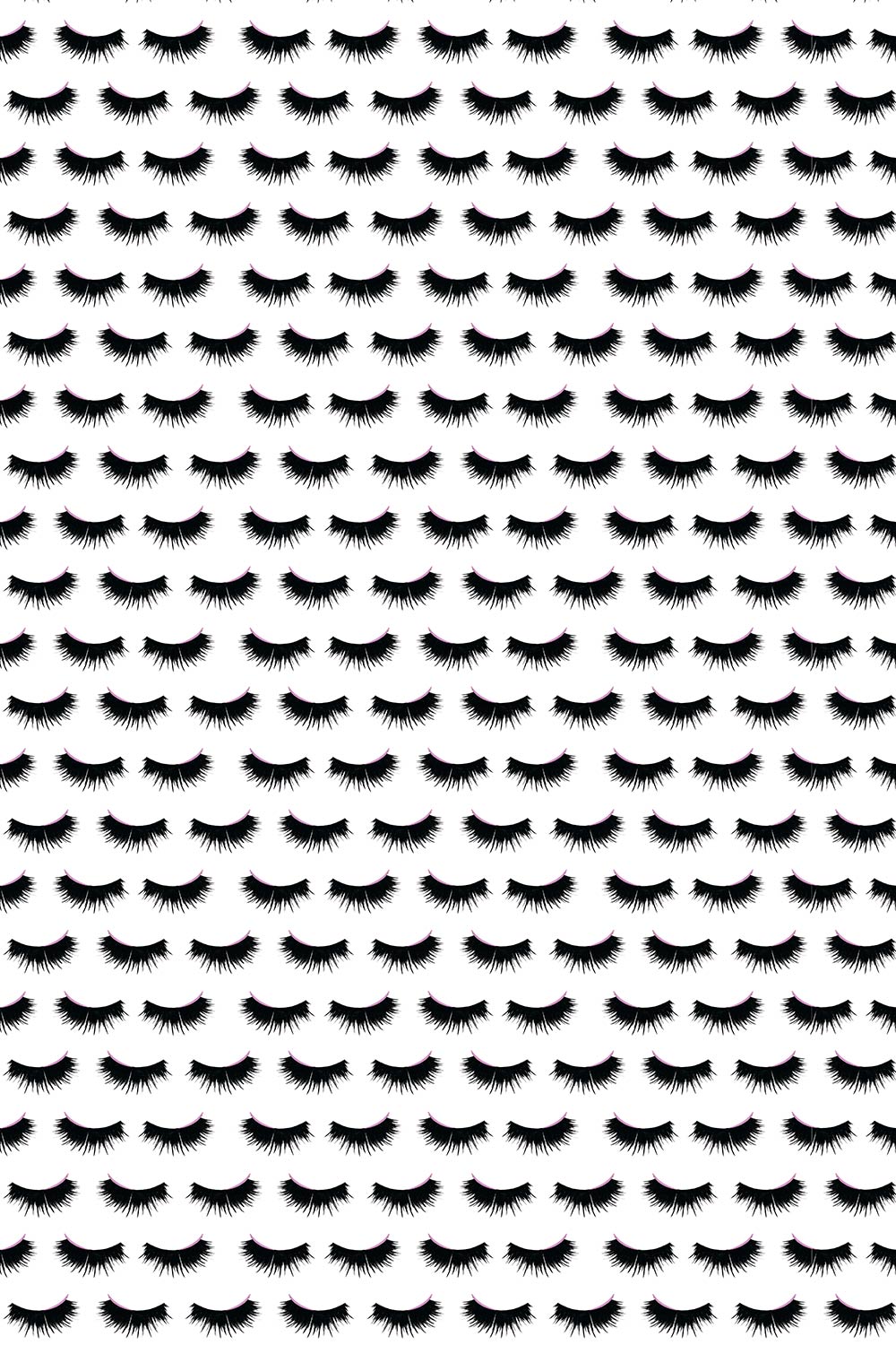Hand-painted eyelash stripe wallpaper on smooth matte paper, featuring black mascara-style lashes on blush, pink, and white backgrounds perfect for feminine bathrooms and retail beauty spas, salons and lash bars