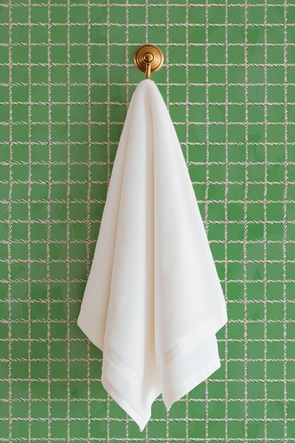 Textured performance vinyl wallpaper with a watercolor background and hand-painted tennis net grid pattern on bright green, great for country club locker rooms and bathrooms due to it's washability and moisture and stain resistance