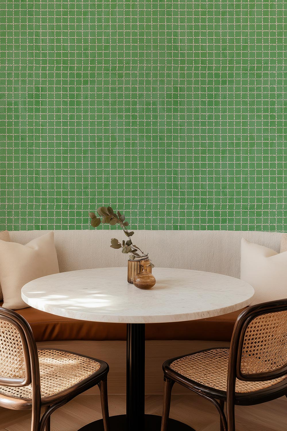 Textured performance vinyl wallpaper with a watercolor background and hand-painted tennis net grid pattern on bright green, great for dining rooms and kitchens due to it's washability and moisture and stain resistance