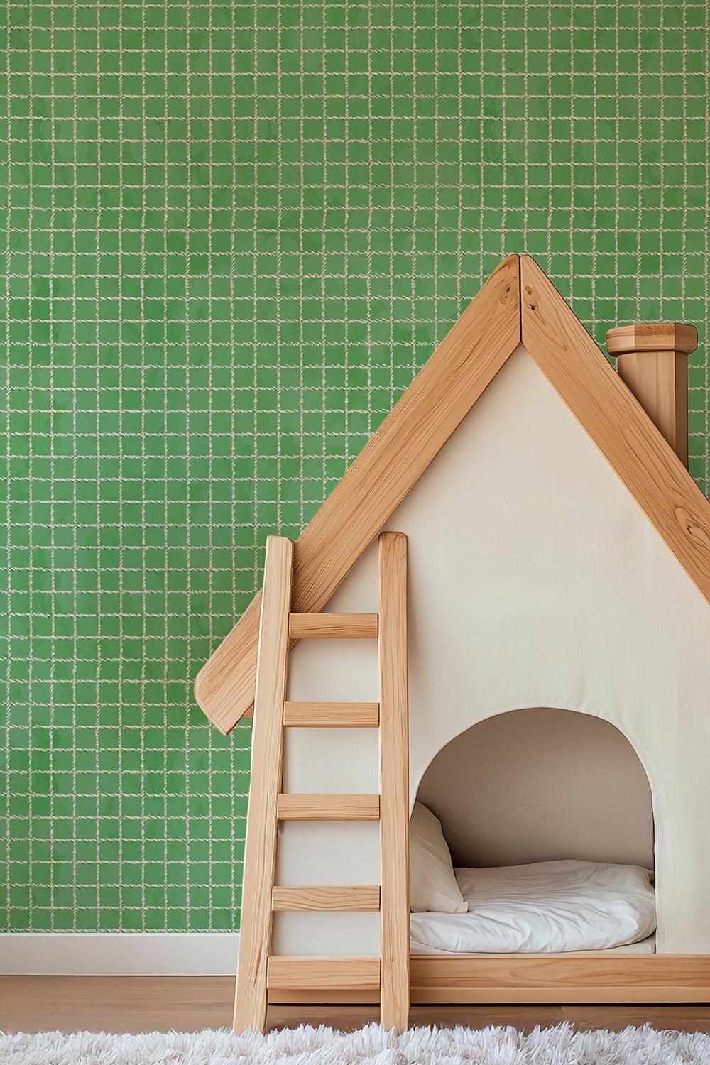 Textured performance vinyl wallpaper with a watercolor background and hand-painted tennis net grid pattern on bright green, great for kid's bedrooms and playrooms due to it's washability and moisture and stain resistance