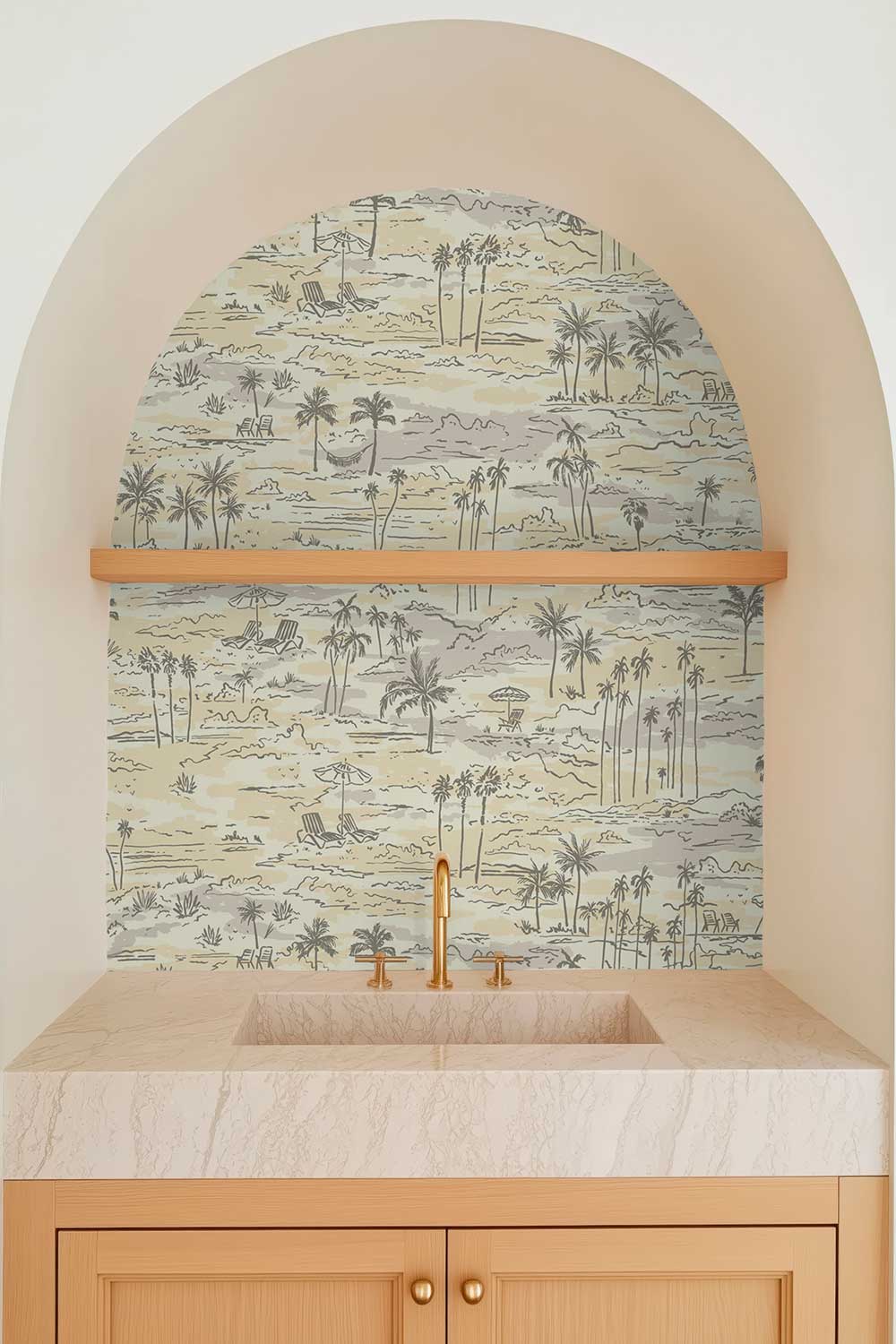 coastal beach inspired toile wall-covering featuring palm trees, ocean waves and lounge chairs in neutral tan printed on commercial grade water and stain resistant performance vinyl wall-covering, great for bathrooms, kitchens and commercial spaces