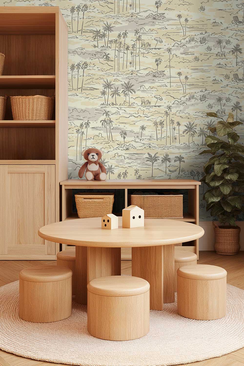 reading nook with performance vinyl wall covering for high traffic spaces in neutral tan beach inspired toile wallpaper