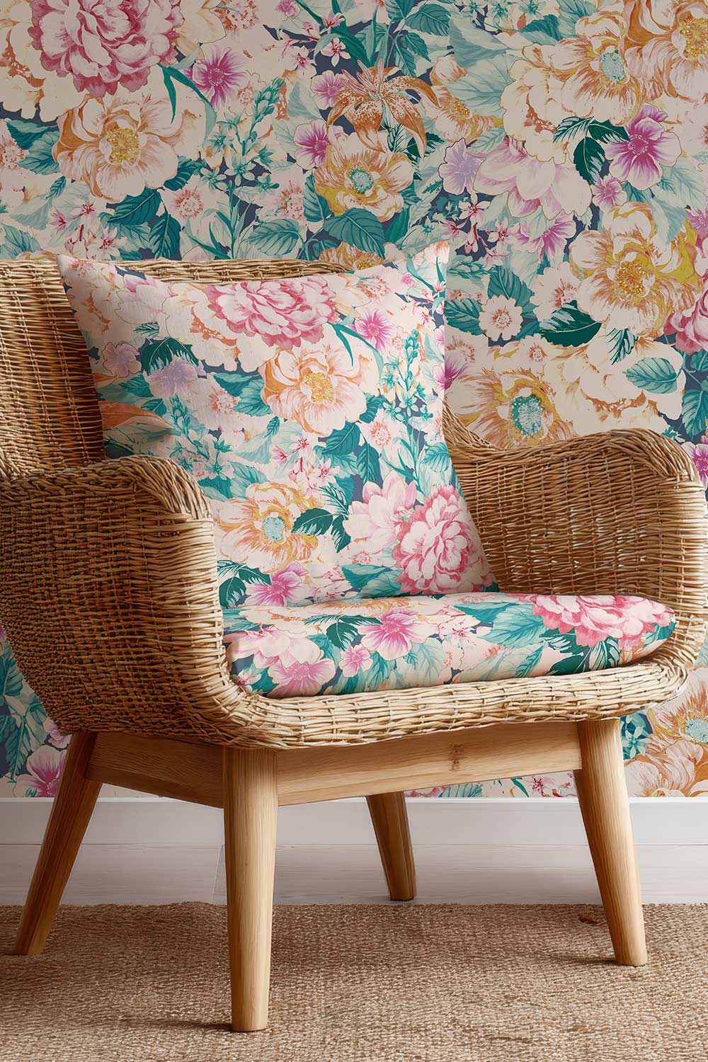 Bold vintage-inspired floral upholstery fabric featuring oversized blooms and rich detail for statement interiors.