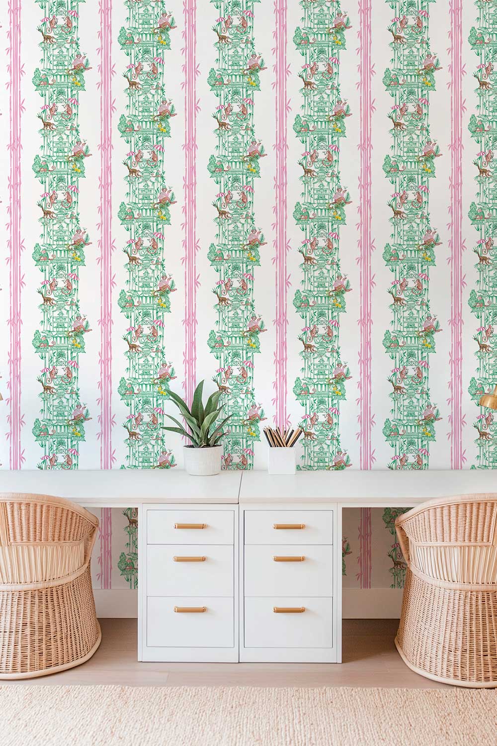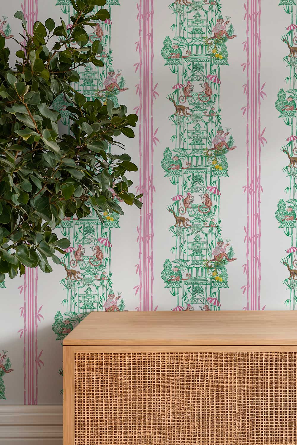 Chinoiserie Shenanigans Toile Grasscloth Wallpaper | Bamboo Grove Green